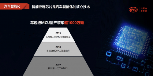 2007年,比亞迪半導體進入工業MCU領域,工業級觸控MCU市場佔有率國內第一。基於行業深厚的積澱、高品質的管控能力與強勁的研發實力,比亞迪半導體從工業級MCU跨越延伸到車規級MCU,並於2018年率先推出第一代8位車規級MCU芯片,2019年推出第一代32位車規級MCU芯片,批量裝載在比亞迪全系列車型,實現汽車整體智能化。比亞迪半導體車規級與工業級MCU芯片,至今累計出貨已突破20億顆。