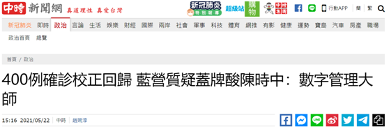 【環球網報道 見習記者 康博浩】據台灣中時新聞網22日消息,台灣疫情指揮中心指揮官陳時中今天(22日)公佈323例新冠肺炎確診病例,另有400例本土個案為校正迴歸上週各日個案,“藍委”陳玉珍痛批,真的是有政府會作帳,民眾將對民進黨當局公佈數據的公信力失去信心;國民黨文傳會副主委鄭照新開酸,“這不是蓋牌(隱藏確診數字),而是校正迴歸”;國民黨籍前新北市長朱立倫的辦公室發言人凌濤嘲諷,如此玩弄數字,陳時中簡直媲美“數字管理大師”。