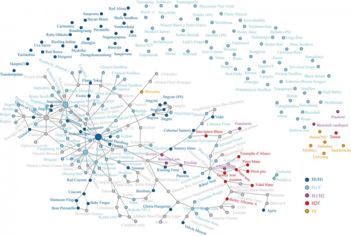 許多釀酒葡萄可以追溯到第一次或第二次事件的基因庫中。諸如嘉本納弗朗、赤霞珠、梅鹿輒和湯普森無核葡萄等栽培品種都來自第一個基因庫。皮諾家族、長相思和佳美則源自第二基因庫。