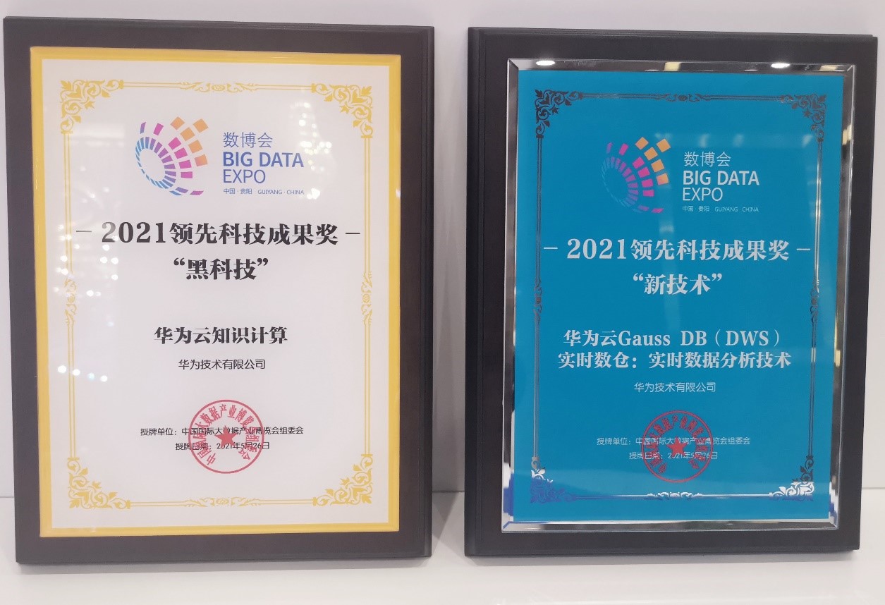 【環球網科技綜合報道】5月26日,2021中國國際大數據產業博覽會(以下簡稱“2021數博會”)在貴陽開幕,並正式發佈“2021數博會領先科技成果獎”名單,其中華為雲知識計算解決方案獲得“黑科技”獎,華為雲GaussDB(DWS)即時數倉即時數據分析技術獲得“新技術”獎。