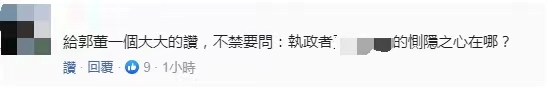 還有網友在稱讚郭台銘的同時質問蔡英文:給郭董一個大大的贊,不禁要問:“執政者”(蔡英文)的惻隱之心在哪?↓