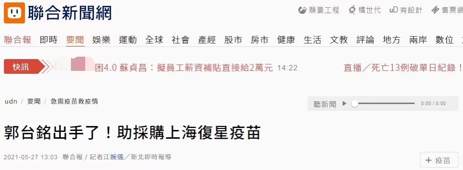 台媒:郭台銘欲出手購買1000萬劑上海復星BNT疫苗,最大障礙是民進黨當局