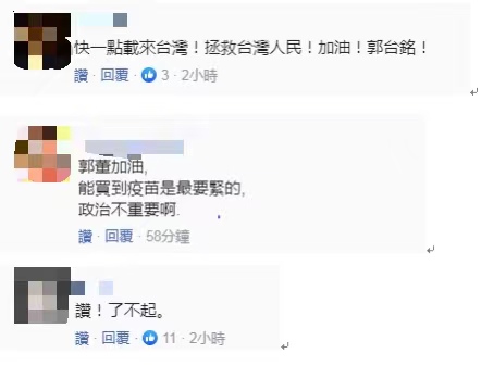 關於郭台銘被證實準備向上海復星購買疫苗一事,不少島內網友都表示歡迎並怒斥民進黨當局無能。許多網友都對郭台銘的做法表示歡迎。↓