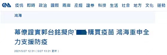 據報道,台灣本土新冠疫情嚴峻,各界高度關注疫苗議題。媒體點名郭台銘、民進黨“立法院黨團”總召柯建銘、大陸上海復星集團董事長郭廣昌三方討論疫苗事宜,郭台銘規劃鴻海及個人出資設置的基金會各出資一半,購買1000萬劑的復星BNT疫苗,但因民進黨當局的政策阻撓,正瀕臨破局。