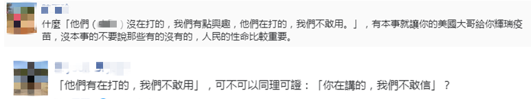 有網友痛斥,“有本事就讓你的美國大哥給你輝瑞疫苗,沒本事的不要説那些有的沒有的,人民的性命比較重要。”“他們有在打的,我們不敢用”,可不可以同理可證:“你在講的,我們不敢信”?