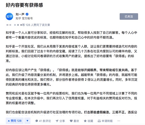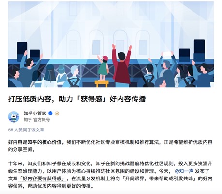 “低質的內容不僅破壞社區的信任度,而且不能為用户帶來收穫感。我們也樂於保持開放、持續溝通,共同維護知乎社區的良好氛圍”,知乎相關負責人表示。
