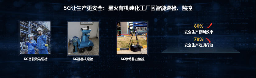 在江西星火有機硅化工廠,通過5G智能終端巡檢、5G機器人巡檢、5G移動作業監控等手段對廠區內全要素進行視頻採集和全天候分析,使得工藝安全預判效率提升了80%;同時,在5G移動作業監控下,生產作業違規行為減少了78%。