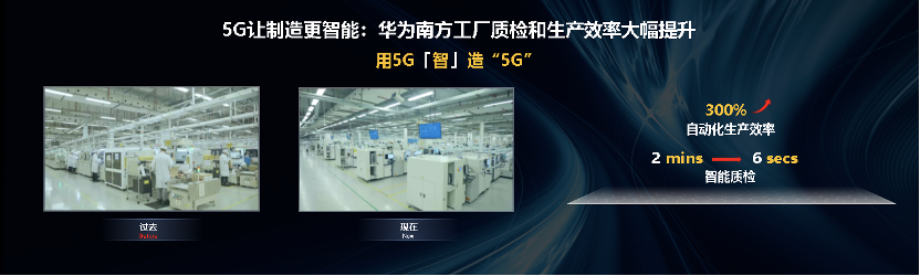 在生產華為Mate、P系列手機的華為南方工廠,我們秉持“自己的降落傘自己先跳”,打造“5G工廠”來製造5G設備。5G與其他智能技術融合,讓製造更智能。
