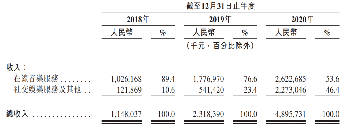 同時,網易雲音樂的招股書首次披露網易雲音樂大量核心運營數據。其中,2020年平台營收49億元,在線音樂服務收入佔比53.6%,社交娛樂服務及其他收入佔比46.4%。2018年和2019年,網易雲音樂營收分別為11億元、23億元。