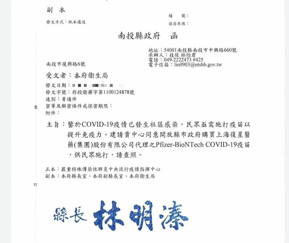 海外網5月28日電 台灣南投縣長林明溱25日喊話台當局,希望向大陸代理商上海復星購買30萬劑疫苗。26日上午,南投縣政府正式發文台流行疫情指揮中心,申請同意開放縣市政府購買BNT疫苗。28日,南投縣政府表示,將聯絡14個藍營執政縣市聯合採購。