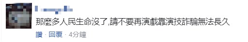 還有人則斥責,“那麼多民眾生命沒了,請不要再演戲,靠演技詐騙無法長久。”