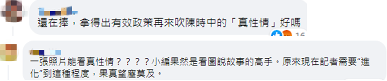 有網友直言,“還在捧,拿得出有效政策,再來吹陳時中的‘真性情’好嗎?”“一張照片能看真性情????小編果然是看圖説故事的高手。”