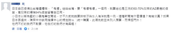 “日本自己疫情比台灣還糟糕,‘考慮’送給台灣,要‘考慮考慮’一個月,就算送也是三流的60-70%效率的AZ最差的疫苗,高效率的輝瑞94%疫苗留著自己用。小日本以鄰為壑的小氣鬼舉世聞名,才不久前就説要排核污染水入海洋就是一例。這種新聞有什麼價值?有幾分真?如果日本丟過來,陳時中你該用指揮中心的規定説統一購買,此項先前並未列入預算,而悍拒門外!他們不打的我們不敢要,他在打的我們才有興趣!”有網友稱。