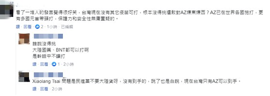 也有網友表示,看了一堆人的發言覺得很好笑,台灣現在沒有其它疫苗可打,根本沒得挑還敢對AZ嫌東嫌西?AZ已在世界各國施打,更有多國元首帶頭打,保護力和安全性無庸置疑的。隨即,就有網友回應稱,“大陸國藥、BNT都可以打啊,是幹話中不讓打。”“問題是民進黨不要大陸貨呀,沒有到手的,説了也是白説,現在台灣只有AZ可以到手。”