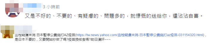 網友擔心最多的是日本“不要的、有疑慮的”才給台灣。有人説,“血栓疑慮未消,日本暫停公費施打AZ疫苗”,“是日本不要的,又要開始炒作了嗎?疫苗換核食嗎?助日漢奸~~~”