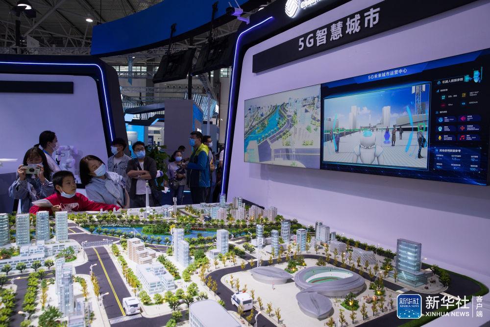 5月27日,在2021中國國際大數據產業博覽會展館,觀眾在參觀5G未來城市運營中心沙盤。