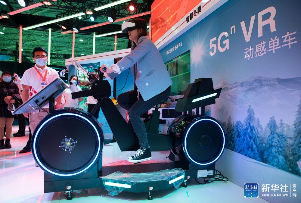 5月27日,在2021中國國際大數據產業博覽會展館,觀眾在體驗5G虛擬現實動感單車。