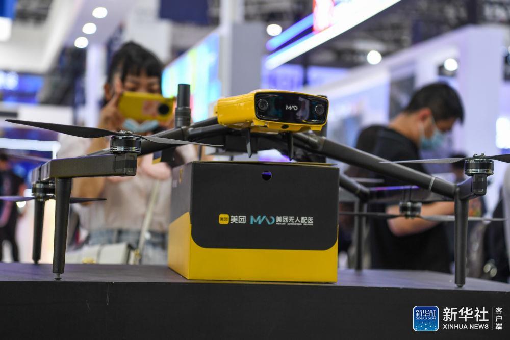 5月27日,參會者在“數博會”上拍攝一款美團配送無人機。