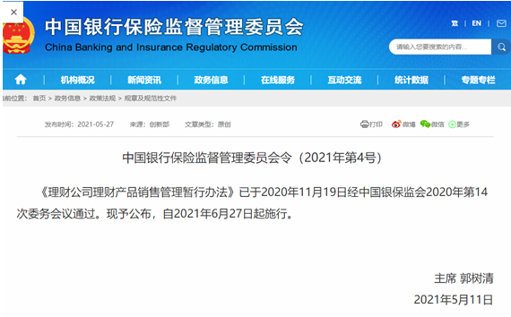 5月27日,銀保監會發布《理財公司理財產品銷售管理暫行辦法》(下簡稱《辦法》),明確理財產品銷售機構範圍、理財產品銷售管理和銷售人員管理,對風險管理與內部控制提出要求,同時提出了適當性管理、客户信息保護以及投資者投訴等要求。