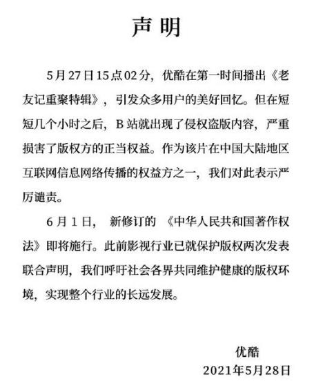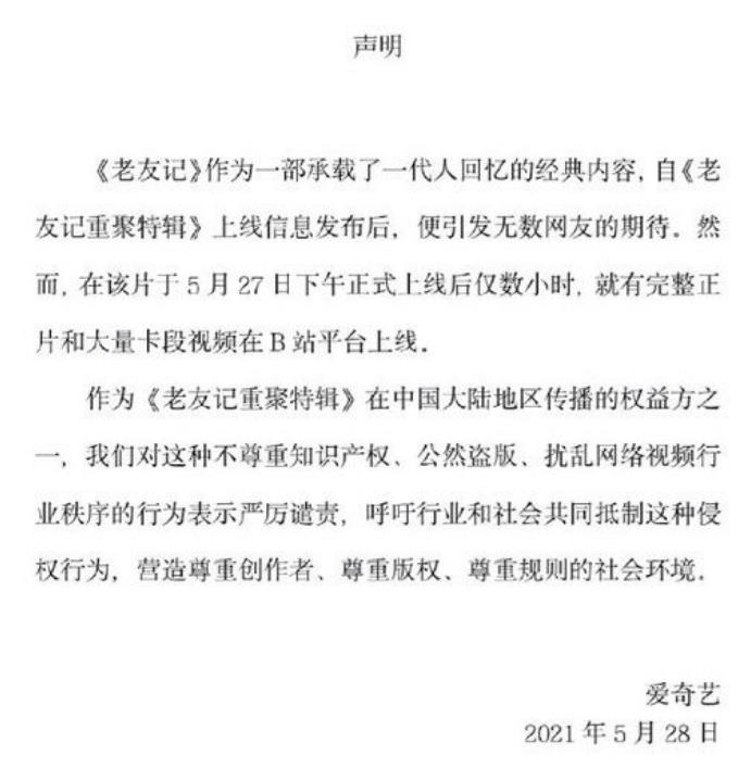 愛優騰三方表示,《老友記》作為一部承載了一代人回憶的經典內容,自《老友記重聚特輯》上線後僅數小時,就有完整正片和大量卡段視頻在B站平台上線。作為《老友記重聚特輯》在中國大陸地區傳播的權益方,呼籲行業和社會共同抵制這種侵權行為,營造尊重創作者、尊重版權、尊重規則的社會環境。