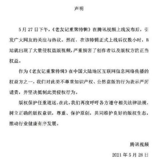*【環球網科技綜合報道】*5月28日消息,愛奇藝、優酷、騰訊視頻(以下簡稱為“愛優騰”)三大在線視頻平台發佈聲明,對嗶哩嗶哩(B站)盜播《老友記重聚特輯》相關內容的行為進行譴責。