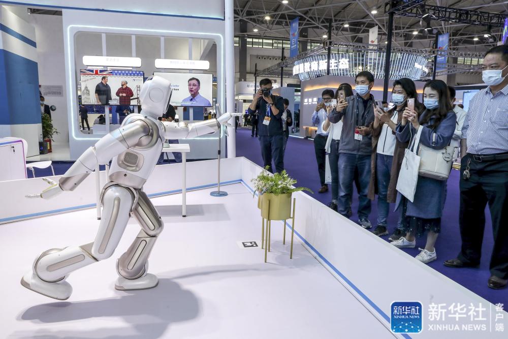 5月26日,參會者在數博會上觀看一款能夠澆花、遞送飲料、踢球的智能機器人。新華社記者歐東衢 攝