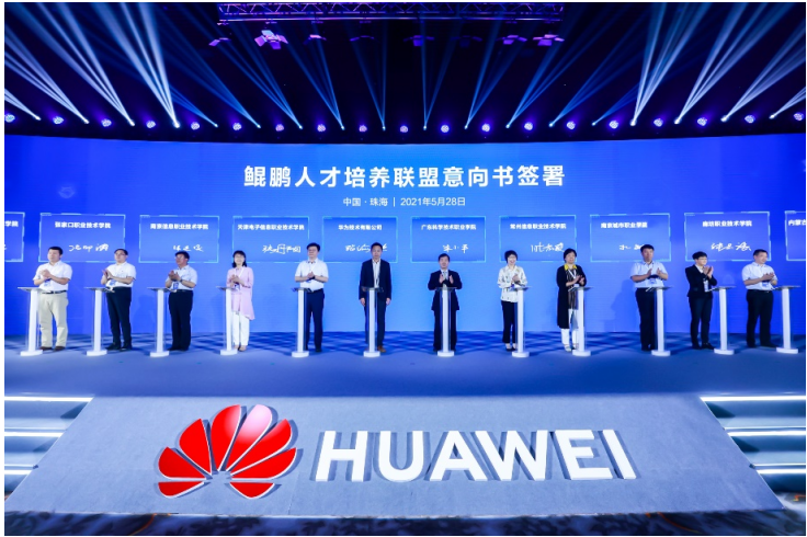 現場還進行了《鯤鵬人才培養聯盟意向書》簽署儀式和雲中高職樣板點揭牌儀式。標誌了華為與職業院校和生態夥伴將共同攜手,不斷落實“雲中高職”發展戰略,努力探索未來智慧化高職教育新形態。