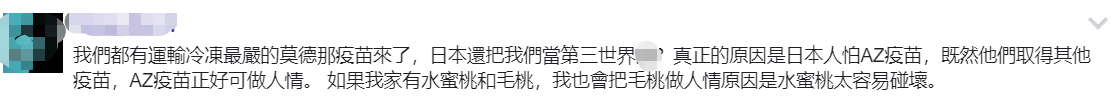 有網友一針見血:真正的原因是日本人怕AZ疫苗,既然他們取得了其他疫苗,AZ疫苗正好可做人情。↓