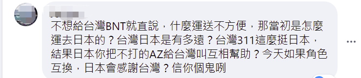對於河野太郎的解釋,不少網友表示不相信。有網友説:“不想給台灣BNT就直説,什麼運送不方便,那當初是怎麼運去日本的?台灣日本是有多遠?台灣3·11這麼挺日本,結果日本你把不打的AZ給台灣叫互相幫助?今天如果角色互換,日本會感謝台灣?信你個鬼咧。”↓