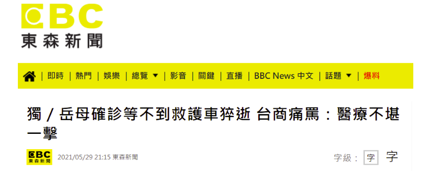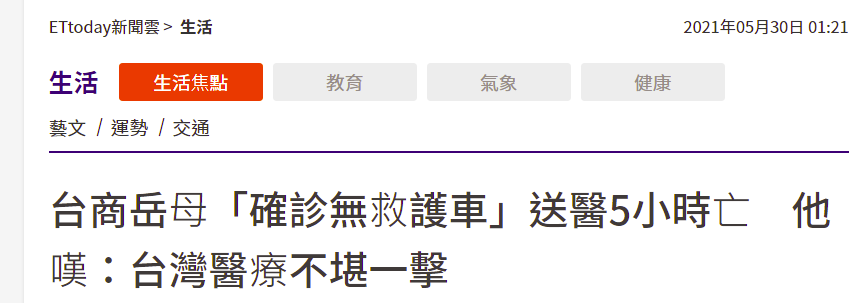 台媒:岳母確診等不到救護車,送醫5小時後身亡,台商痛罵“台灣醫療不堪一擊”
