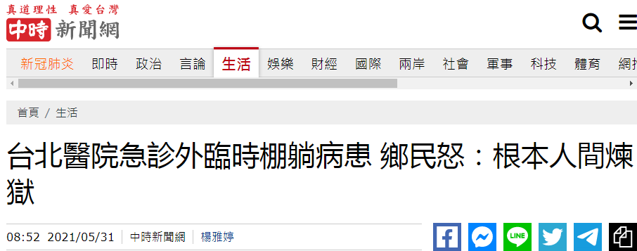 報道稱,30日深夜,島內網絡論壇PTT流傳一段視頻,位於新莊的台“衞福部部立台北醫院”急診室外,架設簡易臨時棚,棚下躺了一牀又一牀的病人,病患之間雖有活動簾隔開,但看起來十分簡陋,令人感嘆許多醫療院所,包括台大及北市聯醫都在臉書發出求救信號,但“衞福部長”陳時中僅以醫療量能的確緊張,還沒崩潰做回應,“衞福部”次長石崇良也宣稱,醫療量能充足、收住院沒問題。
