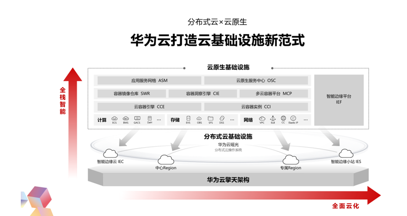 此前,華為雲提出雲基礎設施新範式,致力通過“分佈式雲×雲原生”來助力企業快速實現全面雲化、擁有全棧智能的能力。計算、存儲、網絡等基礎能力,是雲原生基礎設施的底座,也是分佈式雲在不同部署形態下,不可或缺的關鍵能力。