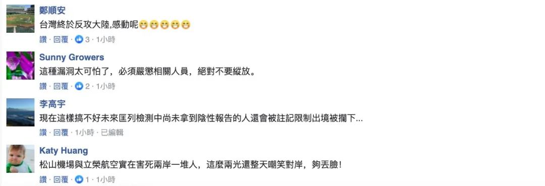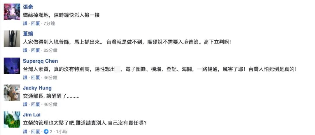在台灣綠媒“自由時報”關於此事的報道下,有台灣網民“倒戈”稱,“人家做得到入境普篩,馬上抓出來。台灣就是做不到,嘴硬説不需要入境普篩。高下立判啊!”,還有網民表示,“台灣人素質,真的沒有特別高,陽性想出去,電子圍籬、機場、登記、海關,一路暢通,厲害了耶!台灣人怕死倒是真的!”,甚至有台灣網民嘲諷稱,“台灣終於反攻大陸,感動呢”。