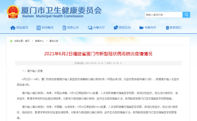廈門市衞健委在6月2日的疫情通報中指出,6月1日0—24時,廈門市報告新增境外輸入新型冠狀病毒肺炎確診病例3例(中國台灣2例,無症狀感染者轉確診1例),並詳細介紹了與台灣地區有關的2例病例情況。