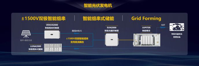 華為顛覆傳統架構,打造面向未來的FusionSolar 8.0智能光伏發電機,包含±1500V雙極智能組串+智能組串式儲能,採用領先的直流耦合架構;基於華為Grid Forming智能光儲協同控制算法,使光伏發電具備同步發電機的關鍵特性,讓光伏發電可儲可控,支持獨立組網,可靠增強電網;能量流與信息流雙向互動,度電成本進一步下降,構建高效、智能、穩定的光伏發電機,最終助力光伏成為主力能源。