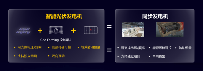 GridForming:使能光伏電壓源屬性,併網特性對標同步發電機,實現1. 智能光伏發電機 2. 可支撐電壓/頻率3. 能源可儲可控 4. 等效轉動慣量 5. 支持獨立組網 6. 雙向互動等六大特性。