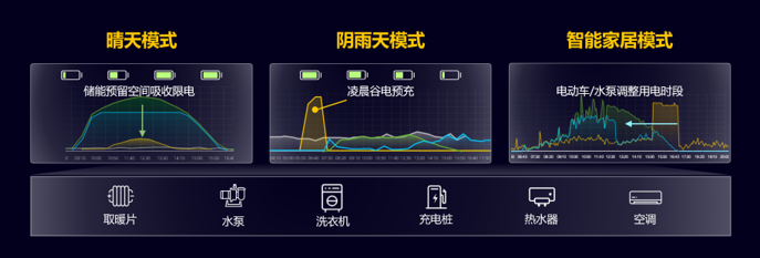 在晴天/陰雨天/智能家居三種常見模式下,AI能全天候最優控制儲能充放電及智能家居用電,從而實現每種場景下綠電收益最大化,並有效提升綠電自用比率。