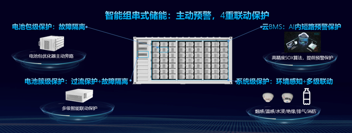 *智能組串式儲能4重聯動保護:*從電池包級、電池簇級、系統級到雲BMS,主動預警,從被動安全到主動安全。