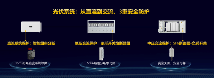 *光伏系統3重安全防護:*從直流、低壓交流到中壓交流,通過智能組串分斷+條形開關熔斷器組+SF6斷路器和負荷開關,實現端到端的安全;