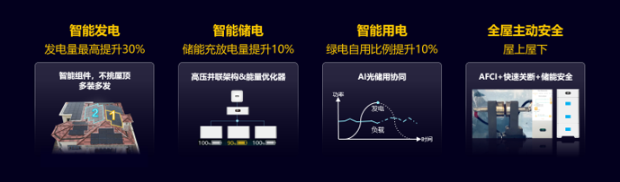 智能用電環節,華為帶來了全新的數字化特性——AI光儲協同。由於光伏發電與用電需求無法完全匹配,導致光伏發電一般僅能自用60%左右,大量的富餘綠電被低價上網,影響收益。而AI光儲協同有效提升用户綠電自發自用比率10%,用電成本降低5%: