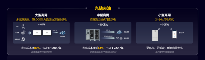 全球約9億人口處於無市電或電力不穩區域,普遍使用油機低效發電,但面臨高碳排放、燃油費用高、效率低、綜合成本高等問題,由此華為推出iPowerCube離網去油綜合供能解決方案,包括大、中、小功率段,涵蓋民生到生產全場景,光儲去油,降低發電成本60%以上,低碳環保,消除能源鴻溝。