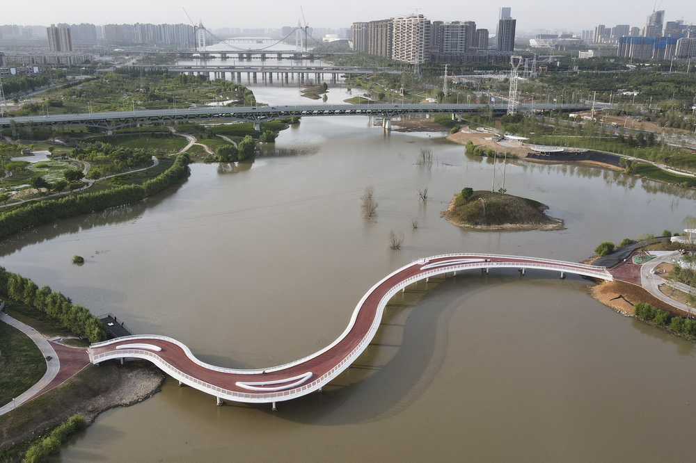 建設中的西安跨灞河慢行橋(5月26日攝,無人機照片)。