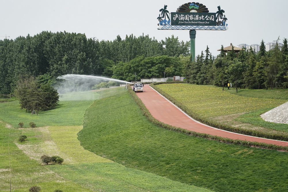 5月26日,在西安滻灞國家濕地公園內,工程車輛在為綠化景觀澆水。