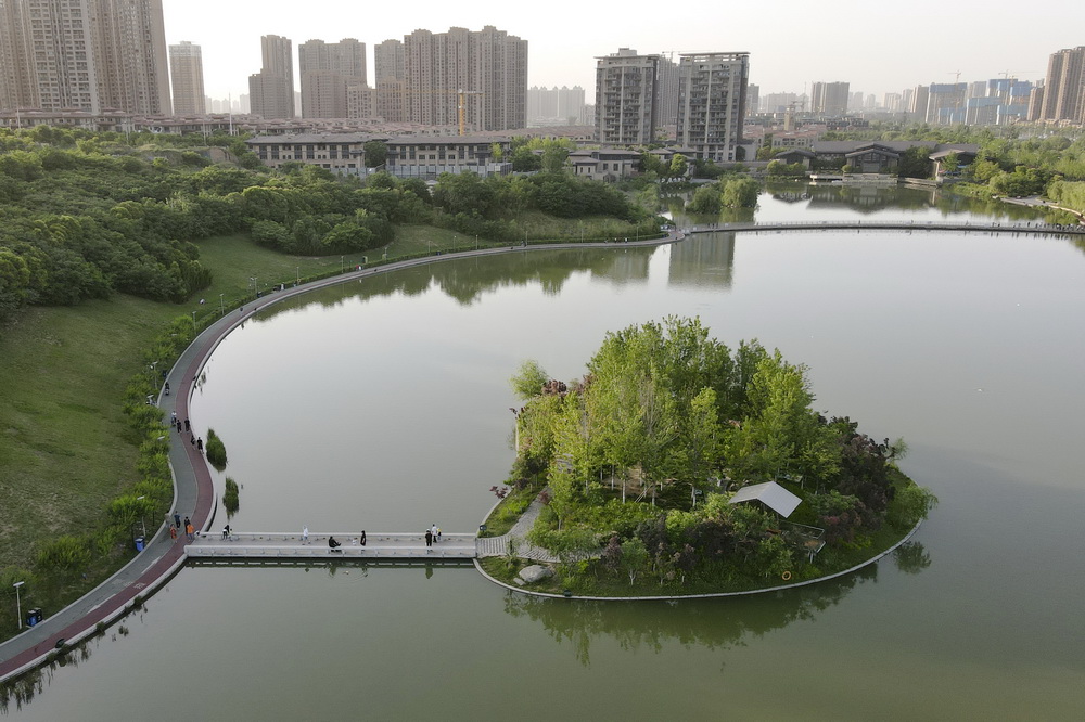 滻河邊的西安雁鳴湖休閒公園內一景(5月28日攝,無人機照片)。