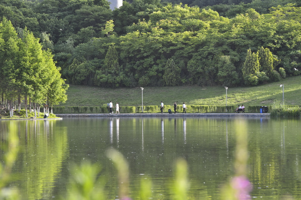 5月28日,西安市民在滻河邊的雁鳴湖休閒公園內休閒。