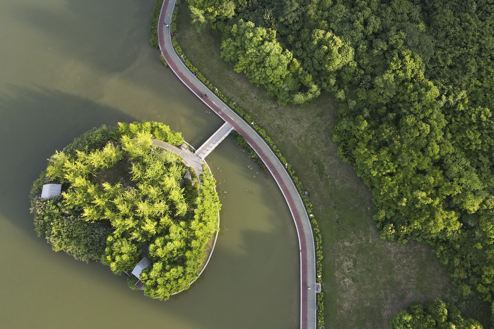 空中俯瞰宛如兩葉綠肺的西安灃河梁家灘運動公園(5月25日攝,無人機照片)。