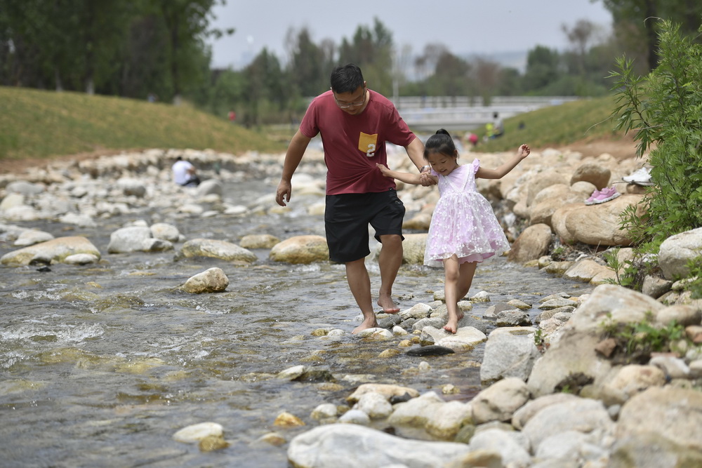 5月29日,一名市民帶着孩子在秦嶺山腳下的休憩驛站“太乙驛”內親水遊玩。