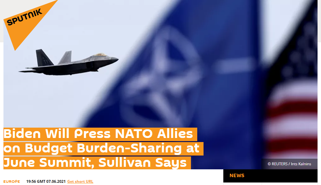 俄媒:拜登將在6月北約峯會上向盟國施壓分攤軍費負擔