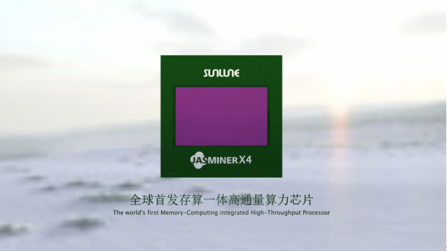 汪福全在發佈會上揭開新一代高通量算力芯片產品—— 一“芯”、一“磚”的神秘面紗。代號為Jasminer X4(中文:茉莉X4)的芯片作為存算一體化的高通量算力芯片,有着超大的芯片面積,裸Die 678平方毫米、封裝尺寸45mm×45mm、訪存帶寬1TByte/s、存儲容量5GBytes、處理能力達到65MH/s,足以媲美高端顯卡,但功耗只有23W,而顯卡的功耗一般在150W以上。