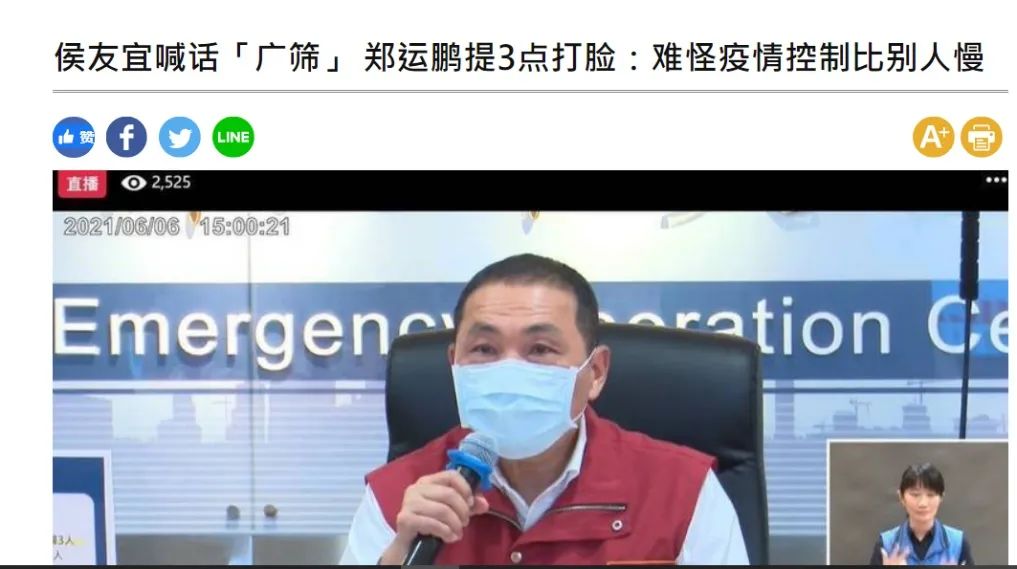 相比之下,侯友宜則在其主政的新北市推動大規模檢測,頗有“和上頭對着幹”的架勢,雙方媒體還多次就此事激烈爭吵。就在6月7日,親民進黨媒體還痛批過侯友宜的防疫舉措,拿“難怪疫情控制比別人慢”來堵侯友宜的嘴。